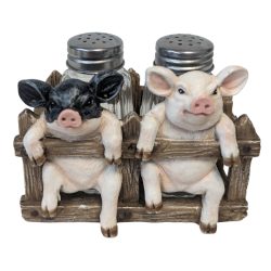 This Salt and Pepper Shaker Set "Proud Seasons" measures 7 3/4" tall, 6 1/2" long and 5" deep approximately. It is made of polyresin, hand painted and polished individually. Color Tone may vary from pictures. Salt and pepper shakers are made from glass